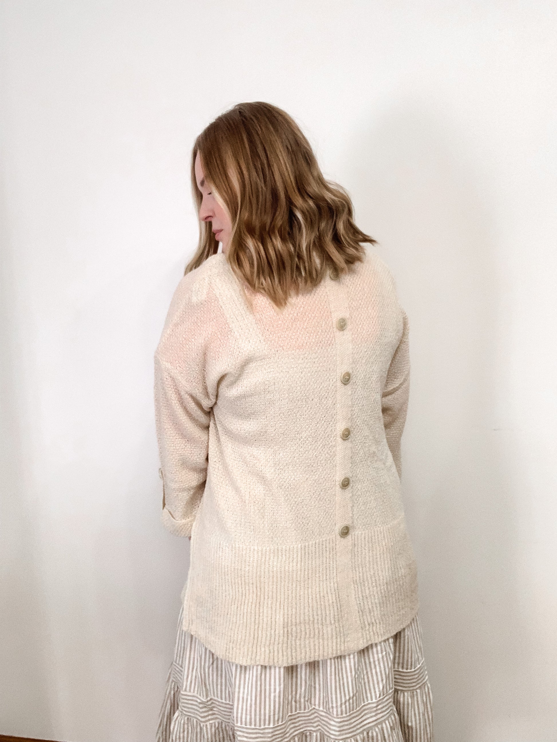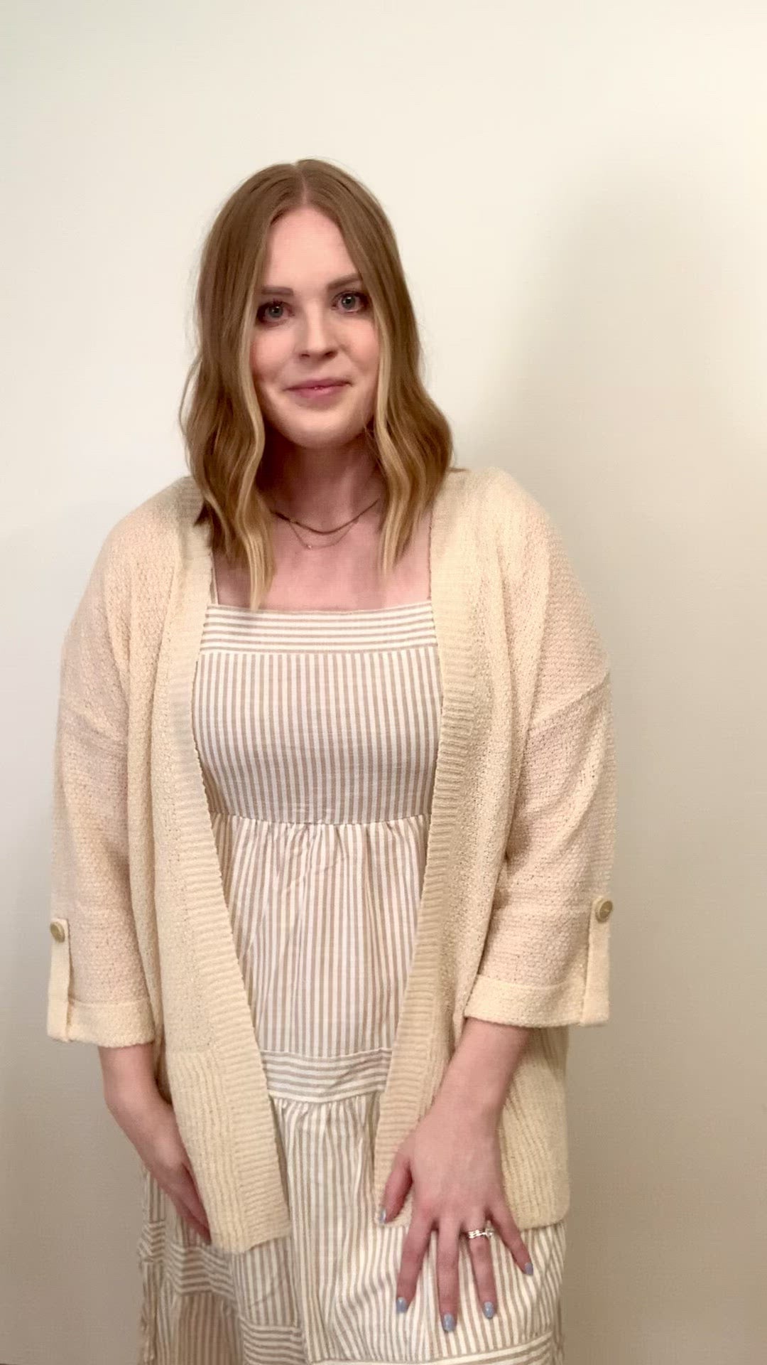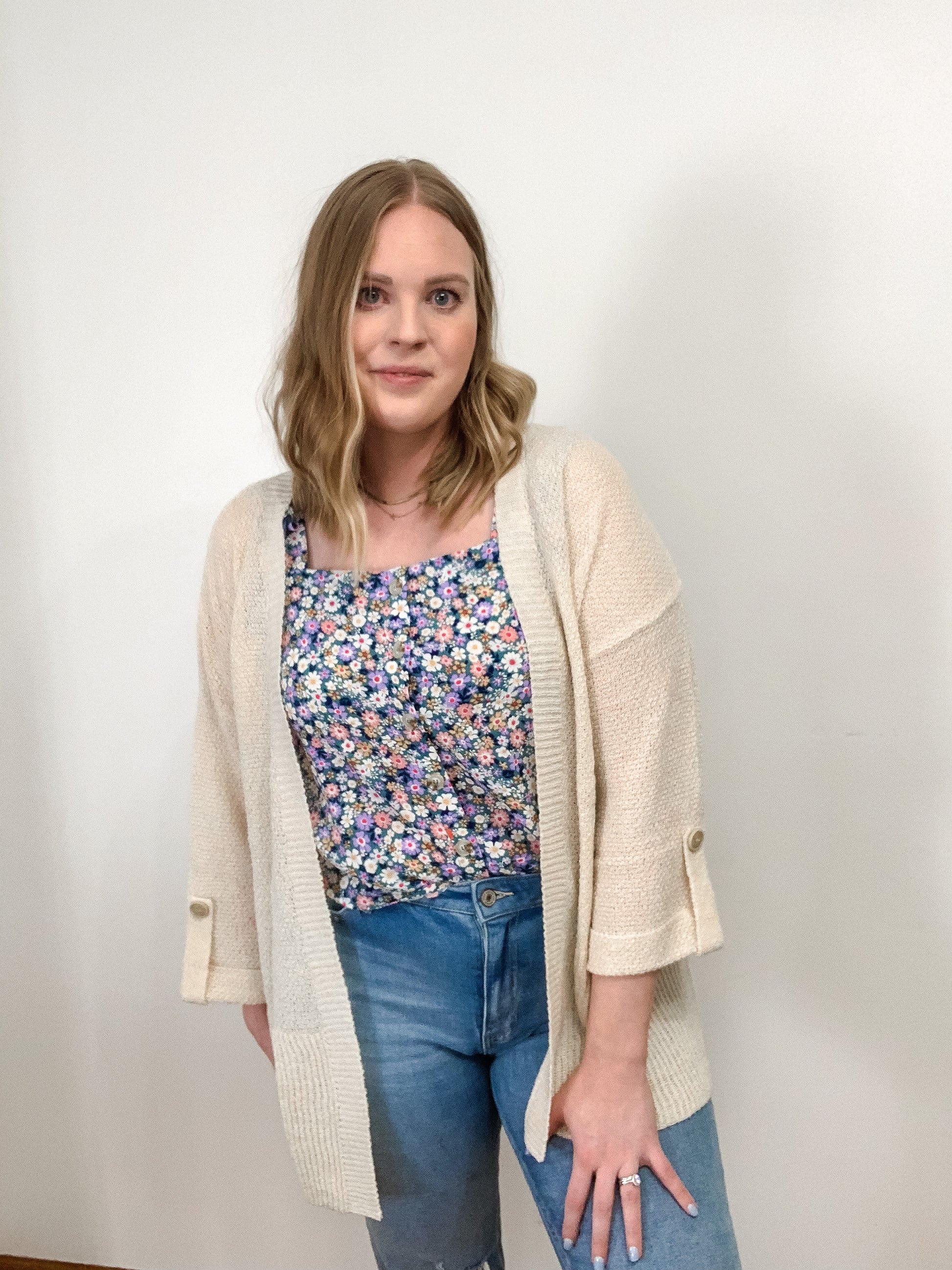 This cream colored cardigan is perfect for spring and summer. It is super light-weight with timeless button detailing. This item is a staple piece that will never go out of style.